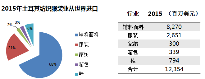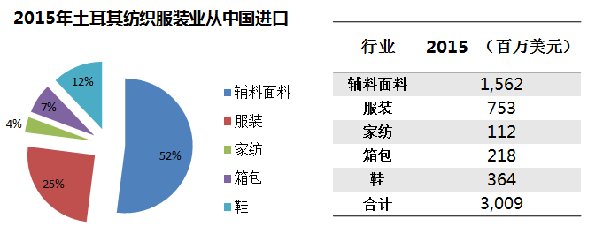 2015年土耳其紡織行業(yè)從中國(guó)進(jìn)口當(dāng)中,輔料面料占比最高,占該行業(yè)52%。
