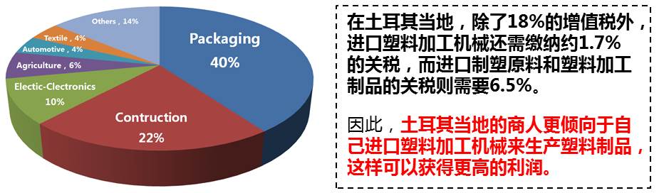 目前土耳其塑料制品主要用于包裝(40%)、建筑(22%)、電子(10%) 農(nóng)業(yè)(6%)、汽車(4%)等行業(yè) 。其中包裝和建筑塑料制品的消費量占主要部分。