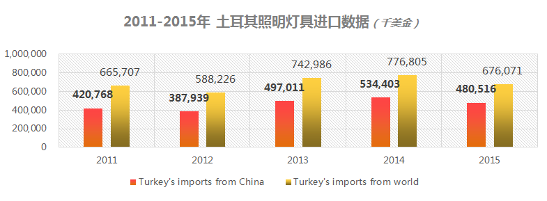 2015年土耳其照明燈具總進(jìn)口額為6.76億美元,自中國(guó)進(jìn)口相關(guān)產(chǎn)品總金額高達(dá)4.81億美元,中國(guó)照明燈具進(jìn)口占比土耳其71.2%,是土耳其的第一進(jìn)口來源國(guó)。