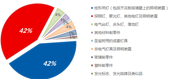 2015年土耳其自中國(guó)進(jìn)口民用燈具產(chǎn)品中,吊燈占比42%,1.64億美金;探照燈聚光燈42%,1.63億美金。