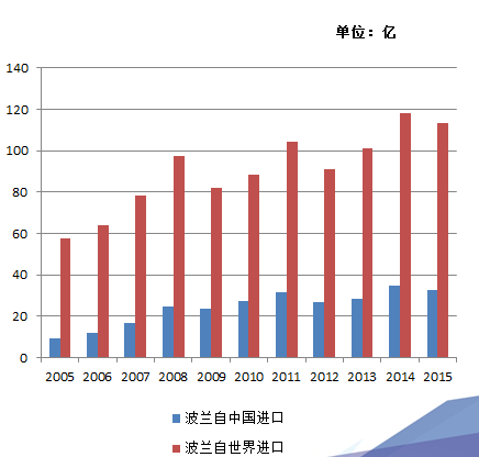 2015年波蘭貿(mào)易進(jìn)口總額為3841.57億美元,其中,中國(guó)對(duì)波出口536.4億美元,同 比去年增長(zhǎng)約3.8%,中國(guó)成為波蘭第二大進(jìn)口來(lái)源國(guó)。