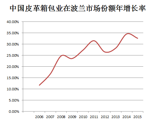 中國(guó)皮革箱包業(yè)在波蘭的市場(chǎng)份額在2011-2012年期間有所下滑,之后繼續(xù)呈現(xiàn)上升趨勢(shì),并在2014年出現(xiàn)了明顯的增幅。