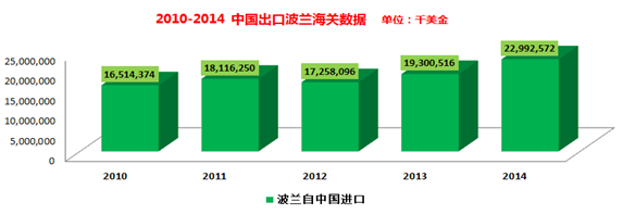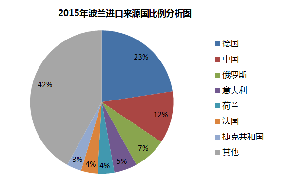 2015年波蘭貿(mào)易進(jìn)口總額為3841.57億美元,其中,中國(guó)對(duì)波出口536.4億美元,同比去年增長(zhǎng)約3.8%,中國(guó)成為波蘭第二大進(jìn)口來源國(guó)。