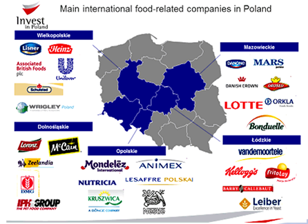波蘭是很多著名食品企業(yè)根源地,如:Mlekovita, Mlekpol, Maspex, Wyborowa, Sobieski, Tymbark , Grycan, Wedel, Soko?ów, Pudliszki, Kujawski , Winiary等。