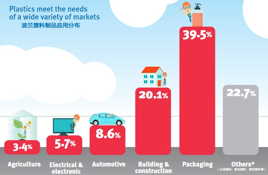 同時,波蘭本身擁有巨大的塑料消費能力,國內(nèi)兩大塑料消費領(lǐng)域分別是包裝行業(yè)和建筑業(yè)。2015年波蘭國內(nèi)的塑料消費已達到320萬噸,占整個歐洲市場的6.6%(4480萬噸),排名第六。隨著波蘭汽車和電子行業(yè)的發(fā)展,波蘭市場的塑料消費將進一步提升。