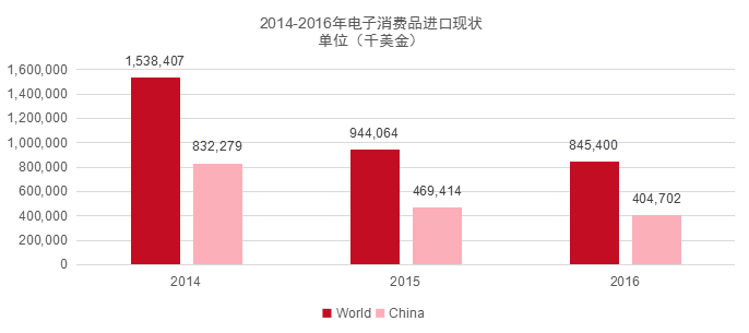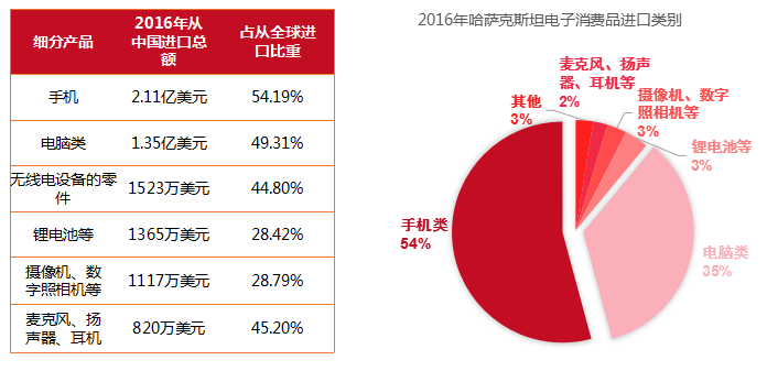 2016年哈薩克斯坦電子消費品從世界進口總額為8.46億美元,其中自中國進口4.04億美元,占比47.84%。熱銷產(chǎn)品進口量前三名的分別為手機類、電腦類、無線電設備零件等。