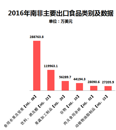 據(jù)聯(lián)合國商品貿(mào)易數(shù)據(jù)庫統(tǒng)計,2016年南非食品貿(mào)易額達到140.6億美元,同比2015年(123.3億美元)增長14.1%。其中食品進口額為59.4億美元,同比增長27.9%;而食品出口額高達81.2億美元,同比增長5.7%。