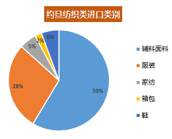 約旦進(jìn)口紡織產(chǎn)品中,輔料面料占59%,服裝占28%,鞋類占6%,家紡占5%,箱包占2%。