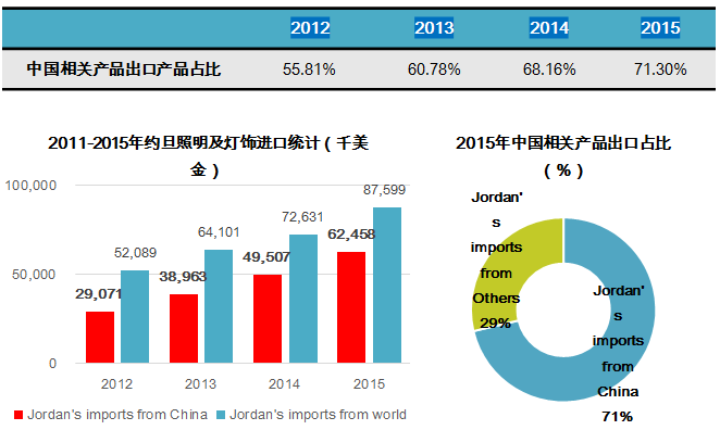 據(jù)TRADEMAP.ORG統(tǒng)計,2015年約旦照明及燈飾總進口額為8759萬美元,同比增長20.59%;