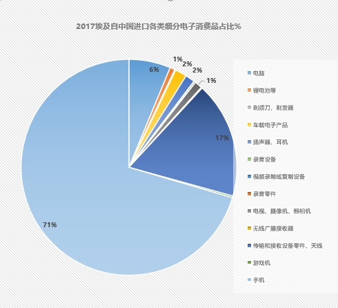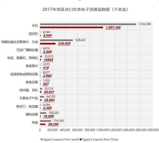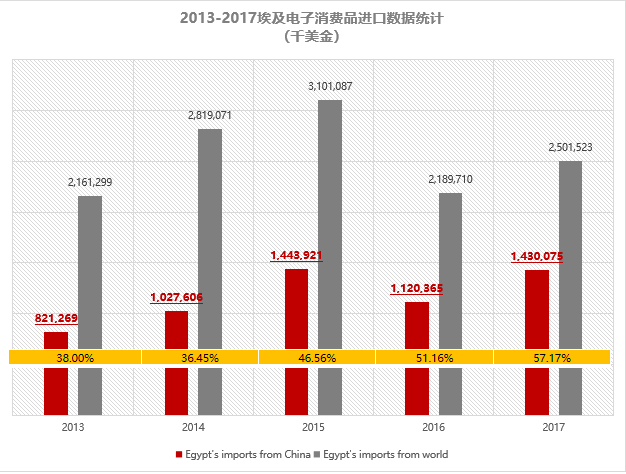 2017年埃及電子消費(fèi)品進(jìn)口量達(dá)25.01億美元。其中自中國進(jìn)口14.30億美元,占比57.17%。近五年,埃及自中國進(jìn)口家電增長了74.2%,中國電子消費(fèi)品制造受到埃及人民歡迎。