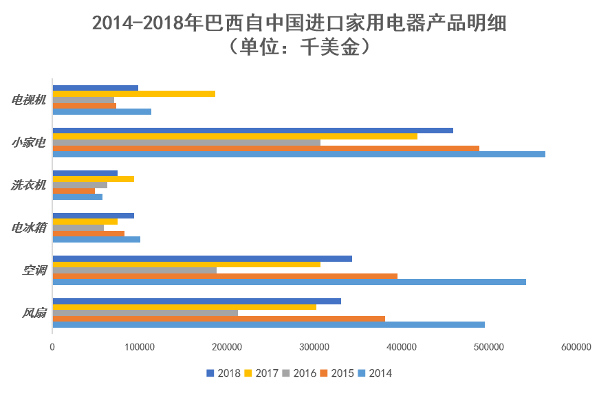 另外,巴西自中國進(jìn)口的小家電進(jìn)口額為4.59億美元,較2017年增長9.15%(2017年小家電進(jìn)口額4.17億美元);隨著巴西經(jīng)濟(jì)的恢復(fù),各類產(chǎn)品進(jìn)口額逐漸上升