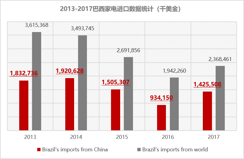 2017年巴西家用電器進(jìn)口量達(dá)23.68億美元。其中自中國進(jìn)口14.25億美元,同比增長52.6%。中國家用電器出口占巴西進(jìn)口市場的60.2%。