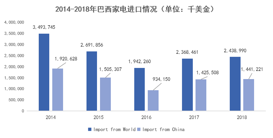 2018年巴西全球家電進(jìn)口額達(dá)24.38億美元。其中自中國進(jìn)口的家電占59.10%,約14.41億美元,是巴西家電第一進(jìn)口來源國。