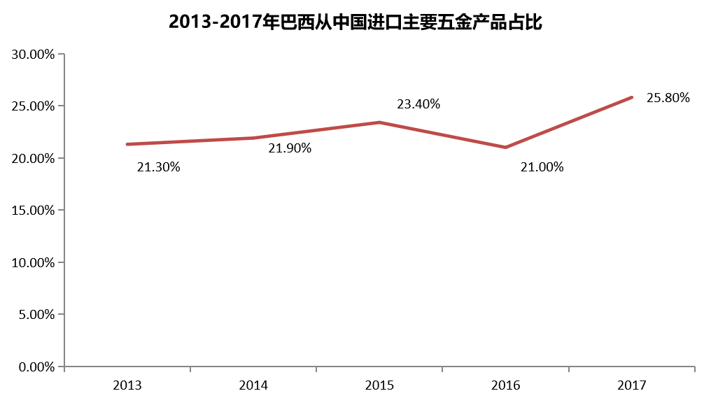 2013-2017年,巴西從中國進(jìn)口的主要五金產(chǎn)品占比基本保持逐年增加,2017年占比達(dá)到最高,達(dá)25.8%。