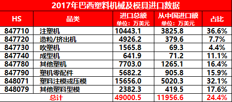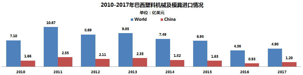 巴西是南美塑料機(jī)械的主要進(jìn)口國(guó)之一,2017年進(jìn)口規(guī)模達(dá)4.9億美元。巴西主要進(jìn)口的塑料機(jī)械包括“注塑機(jī)、擠出機(jī)及其他塑機(jī)”,當(dāng)?shù)厥袌?chǎng)對(duì)“塑料模具”的需求也十分可觀。2017年以前,巴西塑料行業(yè)受全國(guó)經(jīng)濟(jì)衰退的嚴(yán)重影響,自國(guó)外進(jìn)口規(guī)模明顯減少。2017年整體經(jīng)濟(jì)開(kāi)始恢復(fù),塑料加工設(shè)備的進(jìn)口規(guī)模恢復(fù)增長(zhǎng)12.4%。目前中國(guó)是巴西塑料設(shè)備的第二大進(jìn)口來(lái)源國(guó),2017年巴西自中國(guó)進(jìn)口額達(dá)到1.2億美元,市場(chǎng)占比24.4%。其中中國(guó)制造的“注塑機(jī)械和塑料模具”已在巴西當(dāng)?shù)厝〉昧溯^高的市場(chǎng)認(rèn)可度。