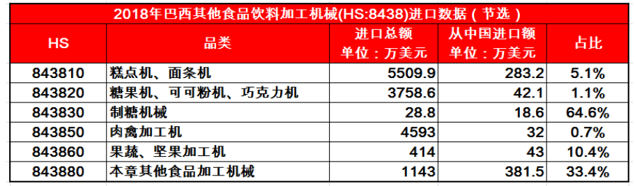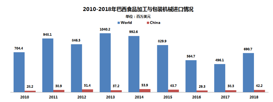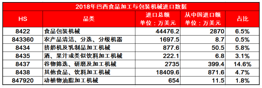 巴西是南美洲重要的食品加工市場(chǎng),每年都會(huì)自國(guó)外進(jìn)口大量的食品加工與包裝設(shè)備,2018年的進(jìn)口規(guī)模達(dá)6.91億美元。