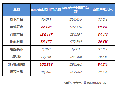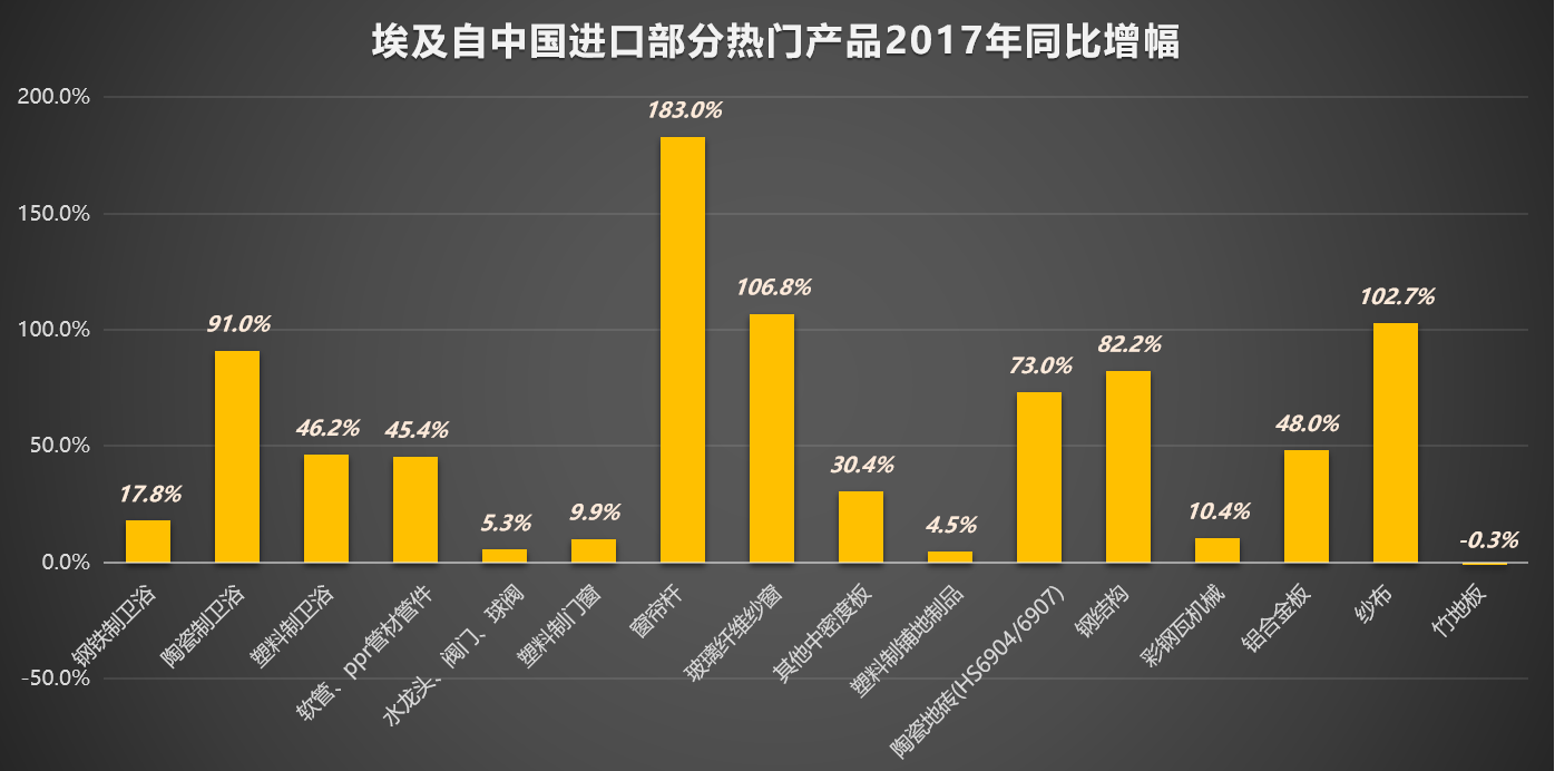 從埃及海關(guān)進口數(shù)據(jù)看,2017年埃及自中國進口金額最大的建材產(chǎn)品為門窗產(chǎn)品、彩鋼瓦機械、建筑五金、地面材料產(chǎn)品等。其中,2017年埃自中進口門窗類產(chǎn)品為1.26億美元。