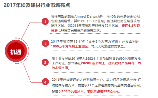 埃及是中東和非洲經(jīng)濟增長最快也是最大的國家,目前基建工程市場需求巨大,比如行政首都建設(shè)、經(jīng)濟特區(qū)建設(shè),同時計劃在13個地區(qū)建造100萬個經(jīng)濟適用住房,價值約400億美元。