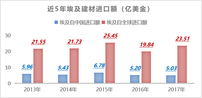 2017年埃及建材產(chǎn)品全球總進口額達23.51億美元,相較2016年增幅高達18.5%。自2016年底,隨著經(jīng)濟改革和新投資法的頒布和落實,埃及經(jīng)濟復蘇,各大型項目也開始啟動,埃及建材需求明顯回暖。其中自中國進口相關(guān)產(chǎn)品達5.03億美元,占埃及同類產(chǎn)品總進口額的21.4%。