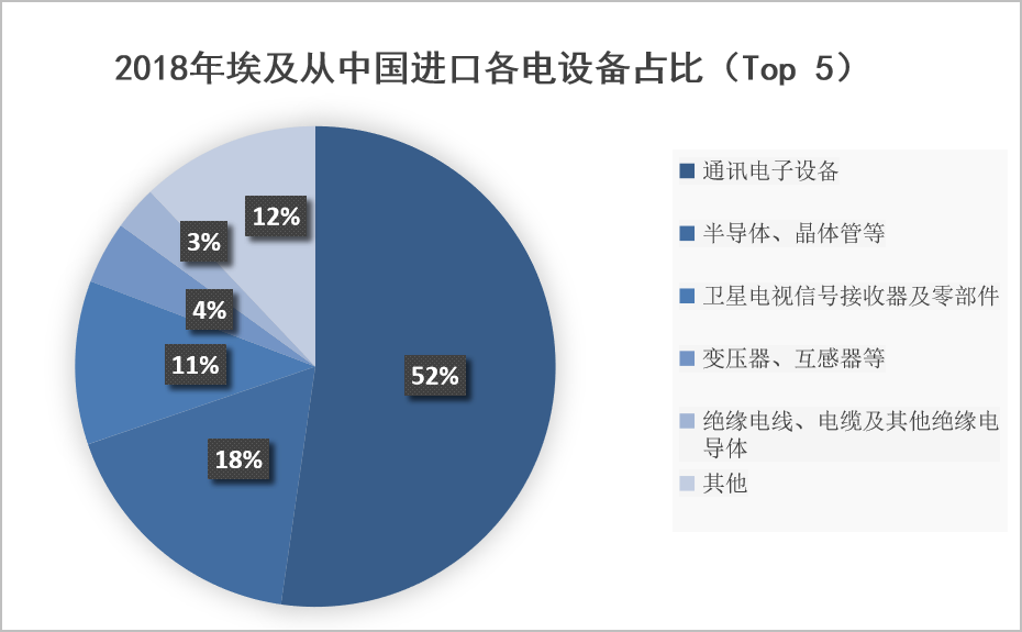 2018年埃及從中國進(jìn)口的電力設(shè)備中,通訊電子設(shè)備占比最多,占比52%,半導(dǎo)體、晶體管、衛(wèi)星電視信號接收器及零部件等分別排名二、三,占比18%和11%。