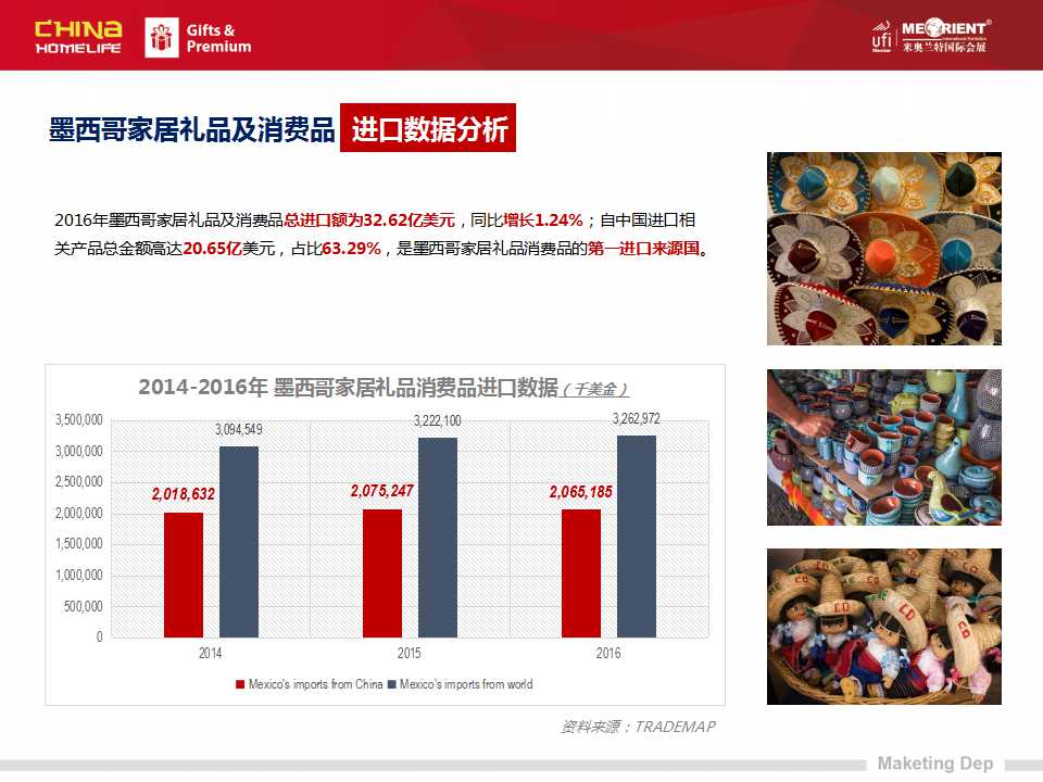 2019年第三屆中國(墨西哥)貿(mào)易博覽會于2019年6月4-6日在墨西哥城會展中心成功召開。本屆展會由廣東省商務(wù)廳主辦,杭州市商務(wù)委、杭州都市圈合作發(fā)展協(xié)調(diào)會辦公室、南通市商務(wù)局、河南省貿(mào)促會、安徽省貿(mào)促會、寧波市貿(mào)促會、江西省對外貿(mào)易促進(jìn)中心聯(lián)合主辦。本屆展會面積達(dá)到26,000平米,展位數(shù)近1,325席,同比上屆增長27%,買家數(shù)達(dá)到23,289人次。而由廣東省商務(wù)廳組織的130家廣東知名品牌企業(yè),以及南通市商務(wù)局組織的32家南通企業(yè)統(tǒng)一參展,組團(tuán)“出戰(zhàn)”美洲市場。