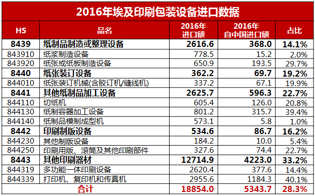 此外,為激勵埃及印刷企業(yè)加大出口力度,埃及政府決定撥款1.45億美金作為印刷設(shè)備采購專項資金,鼓勵企業(yè)采購和升級包裝生產(chǎn)線。僅2016年,埃及對造紙設(shè)備和印刷設(shè)備的進(jìn)口規(guī)模便已達(dá)到1.89億美元,進(jìn)口國家主要有意大利、中國、德國和瑞典。