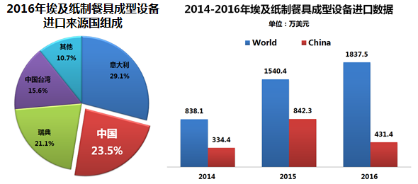 3、市場分析:埃及對紙制餐具的需求量巨大,主要有紙杯、咖啡杯、紙碗、披薩盒等,因此當(dāng)?shù)夭簧偌堉破钒b制造企業(yè)都在不斷擴(kuò)大企業(yè)規(guī)模,進(jìn)口制造設(shè)備,2016年相關(guān)機械進(jìn)口額達(dá)到1837.5萬美元,其中中國占比23.5%