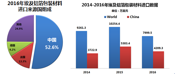 3、市場分析:鋁箔是埃及包裝市場的一大組成,主用應(yīng)用在鋁箔餐具、燒烤鋁箔紙、食品鋁箔袋。2016年埃及鋁箔進(jìn)口規(guī)模近8000萬美元,超過50%從中國進(jìn)口