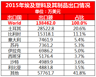 3、除了滿足國內(nèi)市場的塑料需求外,埃及每年也出口大量的塑料制品至非洲和中東其他國家,2015年的出口額高達(dá)13.85億美元,出要出口市場為土耳其和意大利。