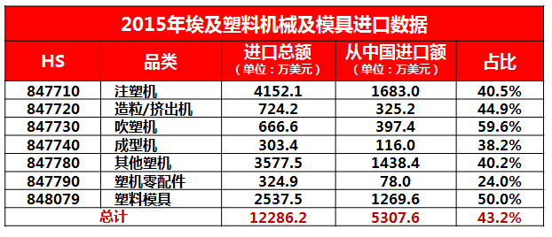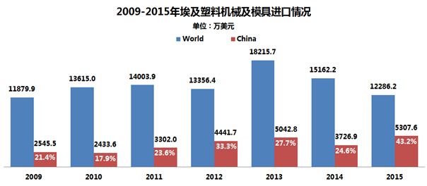 2015年,埃及的塑料機(jī)械及模具進(jìn)口額達(dá)到1.23億美元,其中自中國進(jìn)口的設(shè)備規(guī)模達(dá)到5307.6萬美元,市場份額超過四成。